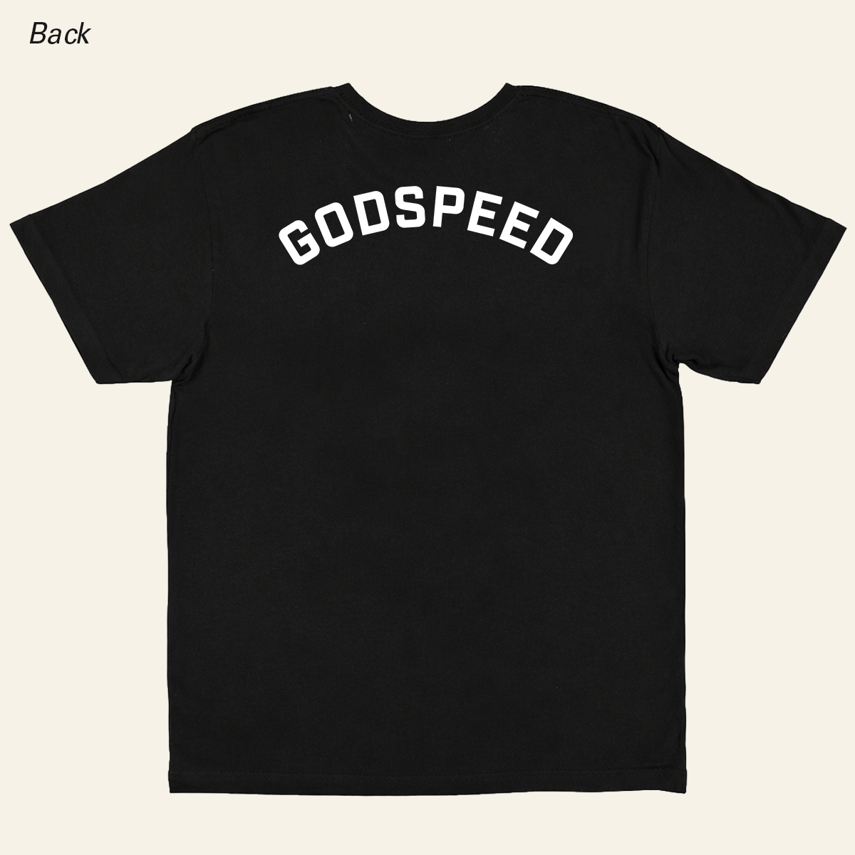 Heavyweight cotton tee featuring the Müjin logo (front) and Godspeed graphic (back).